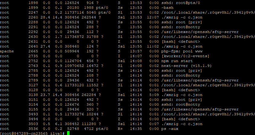 При проверке активных процессов командой ps aux был обнаружен процесс xmrig — известный криптомайнер Monero.